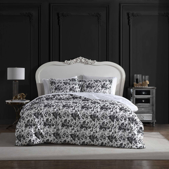 Make a statement with the Betsey Johnson Toile Duvet Cover Set! Featuring dramatic black florals on crisp white, this chic set brings modern romance to your bedroom. Made from ultra-soft polyester, it is lightweight, cozy, and perfect year-round. Inside corner ties keep your insert in place, and a bottom zipper makes care a breeze.Twin duvet cover set includes 1 duvet cover, 1 standard sham. Insert sold separately. Machine washable for easy care.