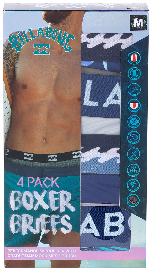 Stay cool and supported with this Mens 4 Pk Print Boxer Briefs. Crafted from a breathable performance fabric blend, each pair features a fly front mesh pouch, moisture wicking properties, and a flex fit design for all day comfort. Ideal for workouts, travel, or everyday wear. Machine washable for easy care. Fabrication is 80% nylon, 20% spandex or 20% elastane.