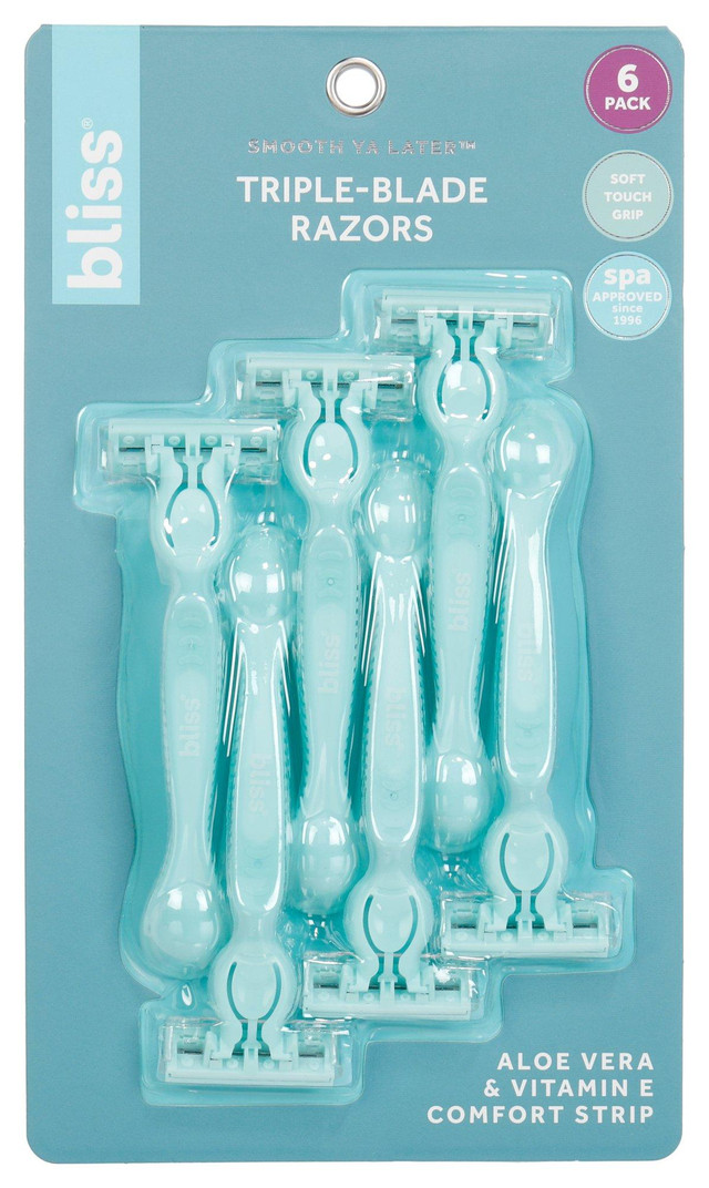 Experience a soothing shave with the Bliss Smooth Ya Later Triple Blade Razors 7-Pack. Each razor features a soft touch grip for maximum control and comfort, plus spa-approved triple blades that glide effortlessly for a close, smooth finish. Infused with aloe vera and vitamin E comfort strips, these razors help calm and nourish skin while reducing irritation. Perfect for legs, underarms, and bikini areasyour go-to for silky, spa-quality results at home.