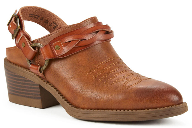 The women's Robin low shaft boots offer a stylish mule design with Western-inspired flair. Featuring a faux-leather upper, harness and braided strap details, and a convertible back strap with adjustable buckle, these boots are 100% cruelty-free and registered with the Vegan Society. Finished with a 2-inch block heel for added height and comfort.