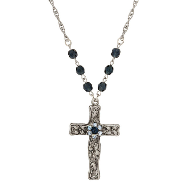 Introducing our antique-inspired flower cross pendant, elegantly suspended from a glass beaded chain necklace. This exquisite piece features a stunning light and dark blue crystal flower at its center, adding a touch of sparkle and sophistication. Perfect for any occasion, this necklace combines timeless elegance with inspired design, making it a meaningful addition to your jewelry collection. Length 28 in., width 32mm.