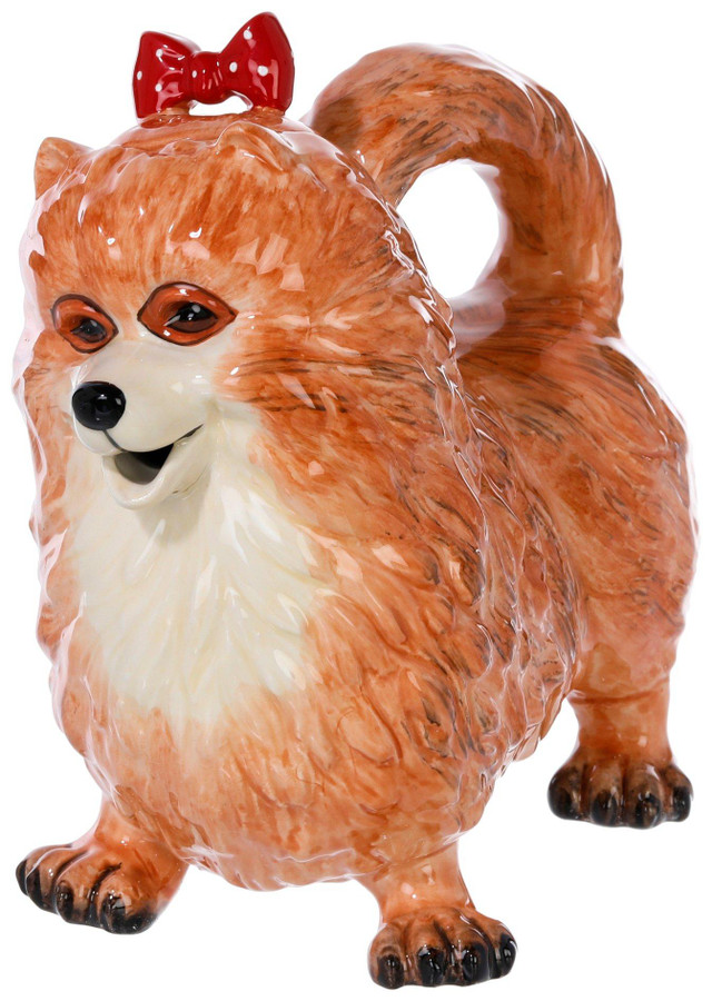 Add playful charm to tea time with the 8 in Whitney Ceramic Pomeranian Dog Teapot. Shaped like a Pomeranian dog with a removable lid on its head, it features a red polka dot bow for easy lifting. Ideal for dog lovers or whimsical kitchen displays. Fabrication is 100% ceramic. Measures approximately 8 in x 8 in x 4 in.