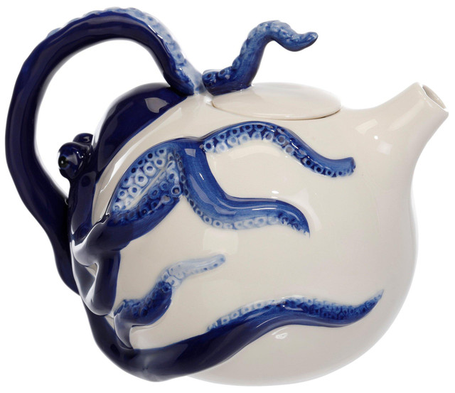Add a splash of ocean charm with the Blue Octopus Teapot. Featuring a graceful octopus design in rich blue tones, this ceramic teapot blends art and function beautifully. Perfect for serving tea with a touch of coastal elegance. Measures approximately 5.5 in x 8.5 in x 7 in.