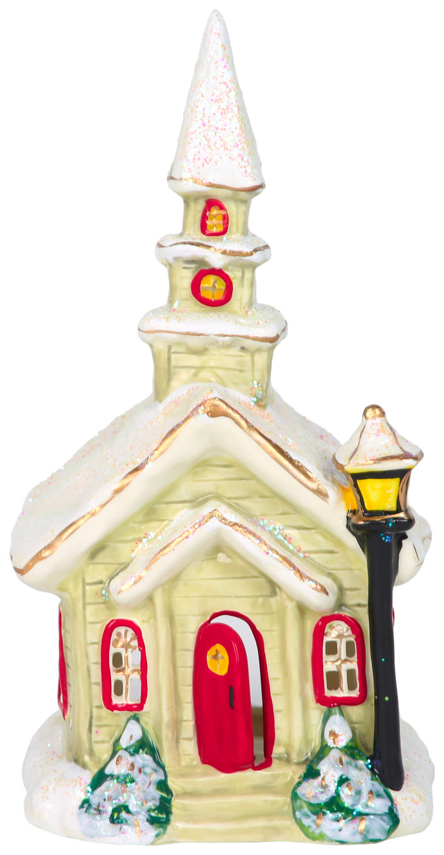 Create a warm, peaceful glow with this Ceramic Christmas Church Tealight House. Featuring delicate windows and classic holiday details, it casts a soft light when lit from within. Perfect for mantels, shelves, or as part of a festive village display. Measures 5 in x 5 in x 11 in