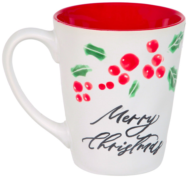 Celebrate the season with the Merry Christmas Red Cardinal Coffee Mug featuring a vibrant red cardinal perched on a holly branch with berries and Merry Christmas text on the reverse. White exterior contrasts with a rich red interior for festive appeal. Fabrication is 100% ceramic. Measures approximately 4.5 in x 4 in diameter.