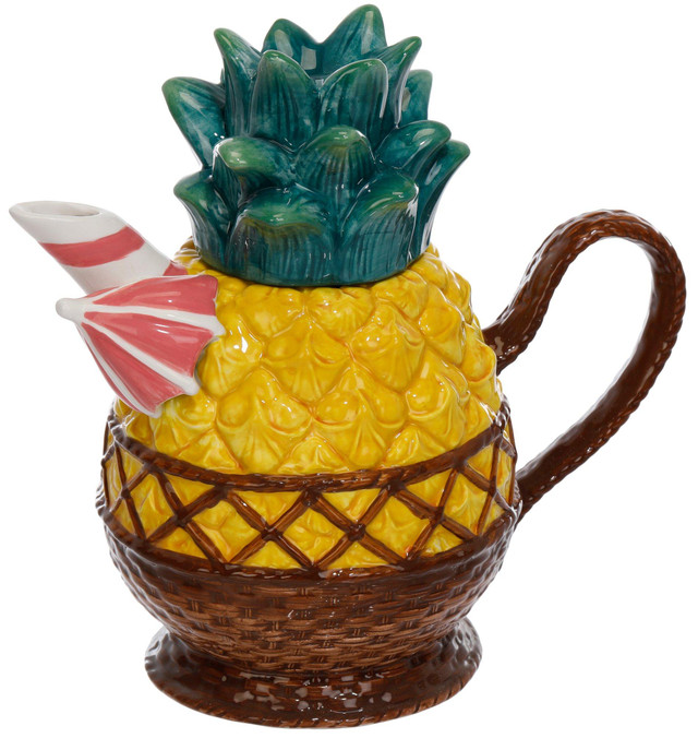 Pour a taste of paradise with the Pineapple Teapot. Featuring a tropical design and crafted with vibrant detail, this ceramic teapot blends playful charm with functional elegance. A delightful centerpiece for tea time. Measures approximately 6 in x 10.5 in x 7 in.
