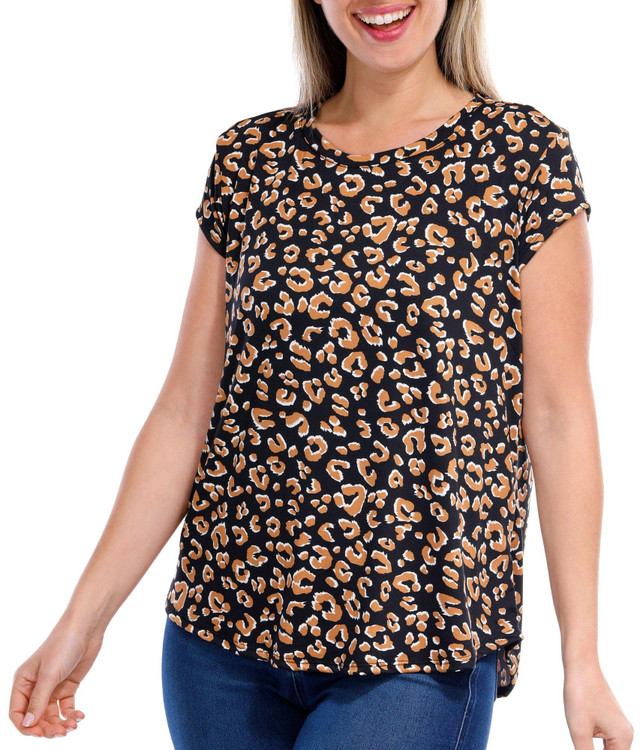 Elevate your everyday style with this stylish cap sleeve top. Crafted from a stretchy fabric blend, this top offers both comfort and flexibility. The round neckline adds a classic touch, making it perfect for pairing with jeans or skirts. Whether youre dressing up for a special occasion or keeping it casual, this striking animal print top is a versatile addition to your wardrobe. Fabrication is 96% polyester, 4% spandex.