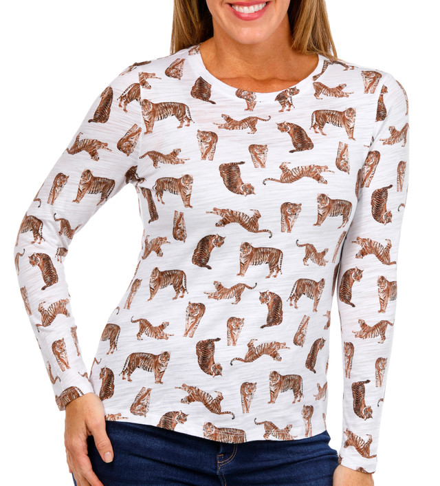 Add a bold touch to your wardrobe with the Petite Long Sleeve Crew Neck Tiger Print Top, featuring a soft breathable drape and striking wild tiger print for effortless style. Perfect for layering under jackets or pairing with slim pants and skirts for a versatile, everyday look. Fabrication is 60% cotton 40% modal. Length measures approximately 25 in.