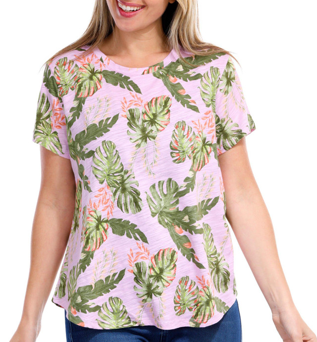 Embrace the essence of summer with the Baja Tropical Short Sleeve Luxey Tee. Featuring a flattering scoop neckline and a vibrant tropical print, this tee is perfect for warm weather and sunny days. Made from soft, breathable fabric, it ensures all-day comfort and ease. Whether you're heading to the beach or a casual outing, this tee adds a touch of tropical flair to your wardrobe. Top length measures approximately 25 in. Fabrication is 60% cotton and 40% modal.