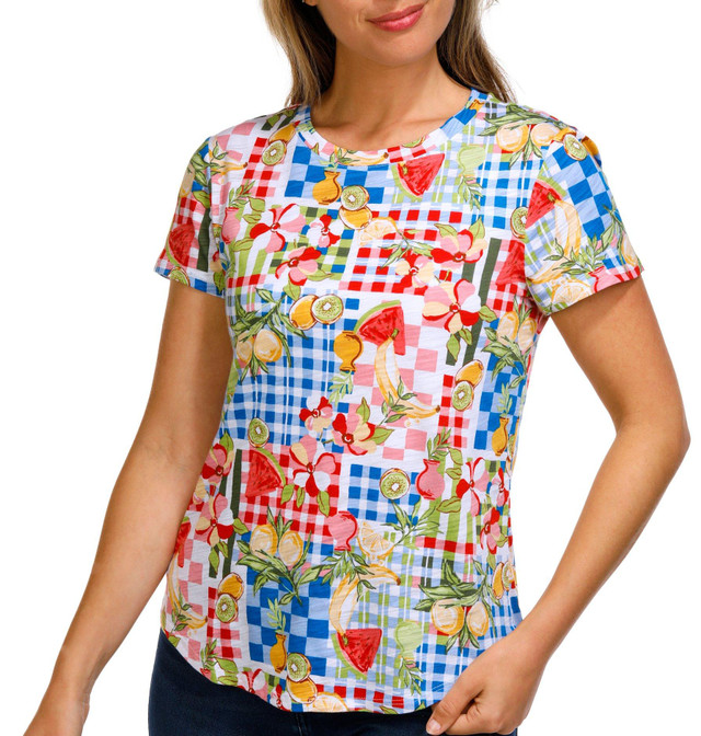 Stay stylish and comfortable in our Petite Short Sleeve Print Luxey Scoop Top. Featuring a flattering scoop neckline and eye-catching prints, this soft, breathable top is perfect for everyday wear. Dress it up or downyour go-to piece for effortless fashion and all-day comfort. Top length measures approximately 26 in. Fabrication is 60% cotton and 40% modal.