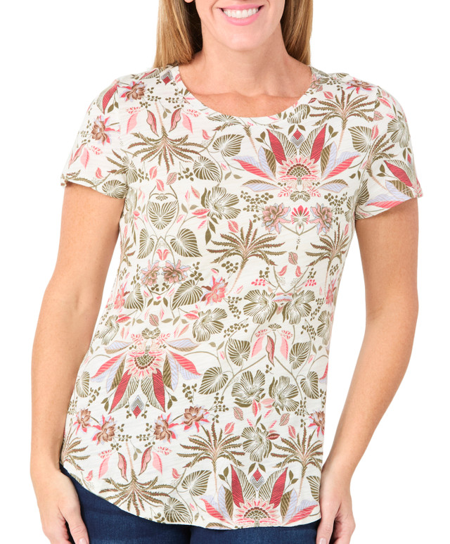Bring elegant charm to everyday wear with the Petite Short Sleeve Scoop Neck Luxey Print Top featuring an allover rio tropical print. Designed with a soft hand feel, short sleeves, and a flattering scoop neckline. Fabrication is 60% cotton 40% modal. Length measures approximately 26 in.