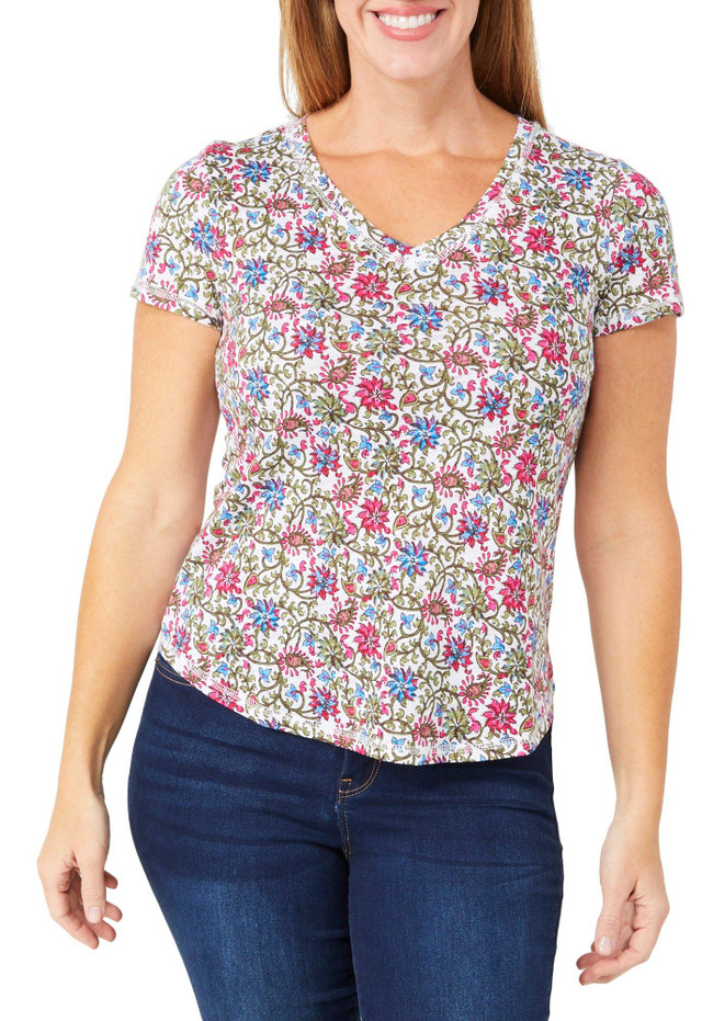 Breeze through summer in this Petite Short Sleeve Vines V-Neck Top, crafted from a soft cotton-modal blend. Featuring a vibrant vine print, flattering v-neckline, and airy short sleeves, it is perfect for warm, sunny days. Fabrication 60% cotton, 40% modal