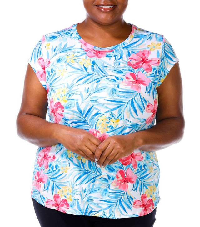 Stay cool and stylish in this USA-made plus-size floral top! Designed with a round neck and capped sleeves, its crafted from 90% polyester and 4% spandex for a soft, stretchy fit thats cool to the touch and flowy all day. The vibrant floral print adds charmperfect with jeans and sandals for brunch or layered under a denim jacket for a casual-chic vibe.