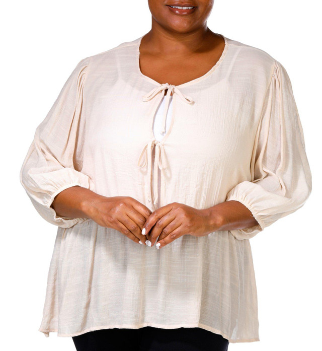 This blouse features a round neckline with a center string tie and softly puffed quarter sleeves with cinched ends. The waistline opens into a gentle flare, creating a flowy peplum-style silhouette that adds movement and a flattering shape.