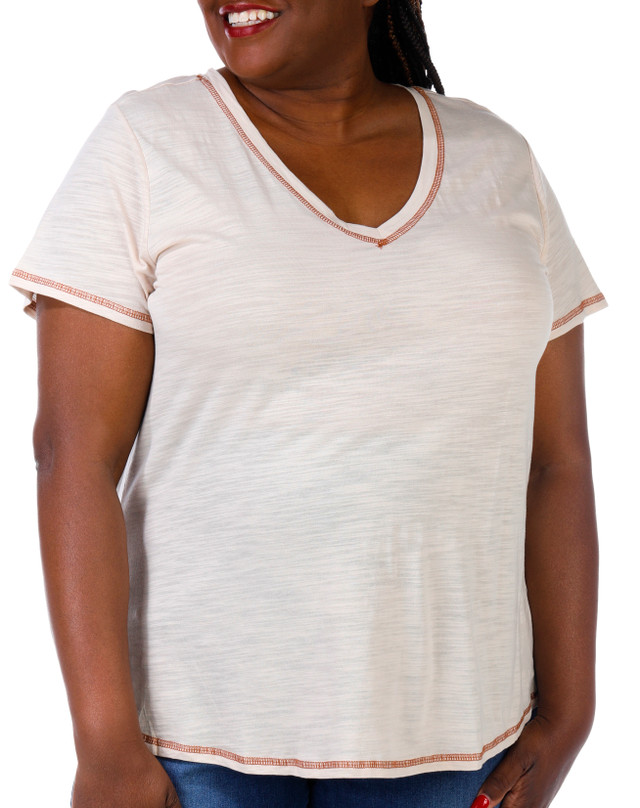 This short sleeve top features a solid color design on lightweight knit fabric, a v-neckline, embroidered seam details, and classic styling. The top length measures approximately 28 in. Fabrication 60% cotton, 40% modal.