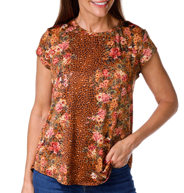 Turn heads with this womens short cap sleeve top featuring a bold animal print base layered with delicate floral accents. The soft stretch fabric blends comfort with style, while the round neckline keeps the look classic. Perfect for adding flair to jeans or skirts, this top brings a wild yet feminine edge to your wardrobe. Length is approximately 25 inches.