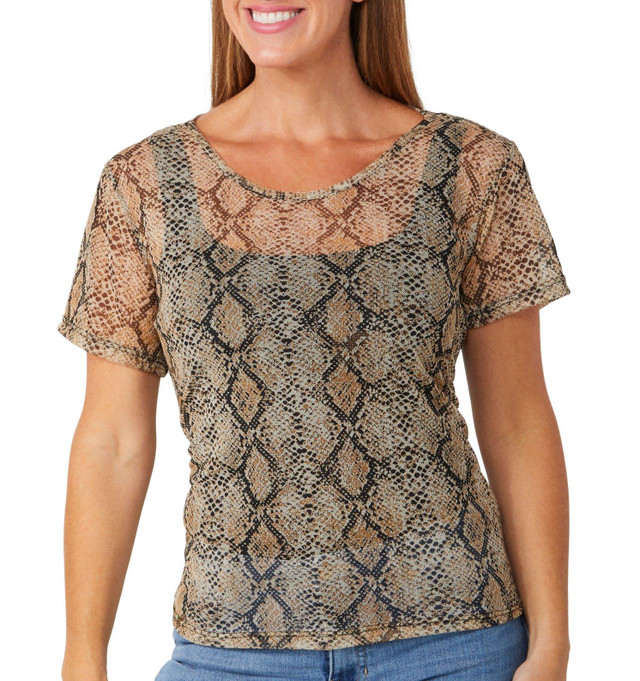 Unleash your wild side with this short sleeve top, crafted from breathable mesh fabric and featuring a fierce animal print. Lightweight and edgy, its perfect for layering or making a statement on its own. A bold choice for those who love to stand out in style. Fabrication is 95% polyester, 5% spandex.