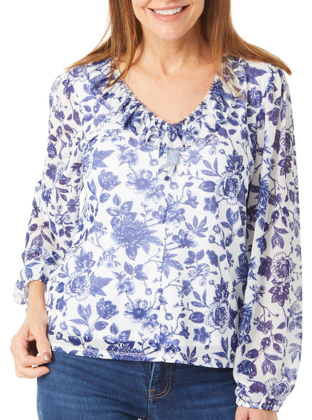 Crafted with a delicate blend of 78% nylon and 22% spandex, this top hugs your curves with a comfortable stretch. The middle layer, made of 100% polyester, adds a layer of sophistication and structure. The ruffle detailing along the long sleeves brings a playful yet refined touch, while the floral mesh design exudes femininity and charm. Top measures approx 23 inches.