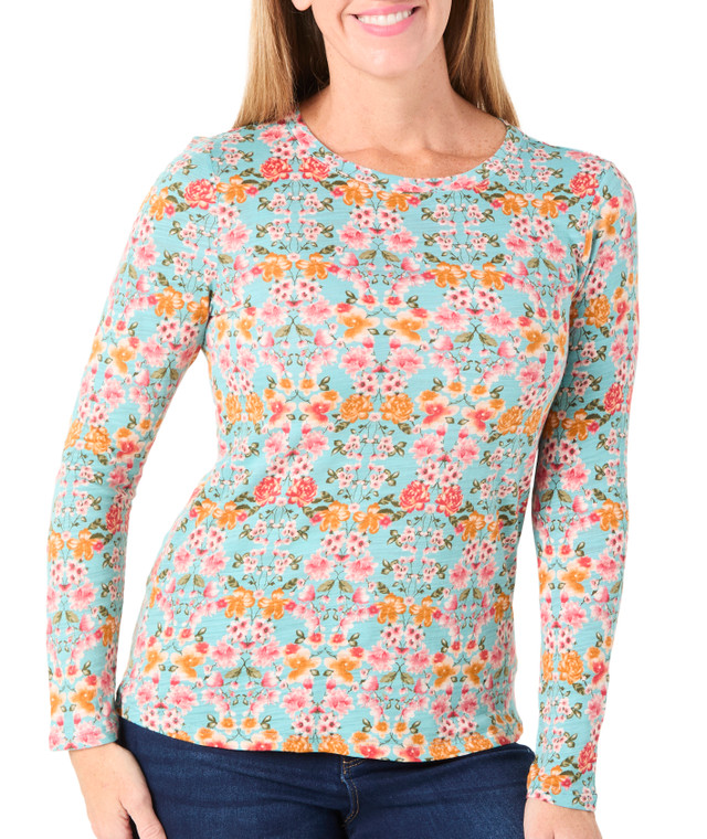 Add a touch of elegance to your everyday style with the Womens Floral Luxey Long Sleeve Crew Neck Top. Featuring an allover ornamental floral pattern, it combines softness with a refined visual appeal. The crew neckline and long sleeves provide effortless versatility for work or weekend wear. Fabrication is 60% cotton 40% modal. Length measures approximately 25 in.
