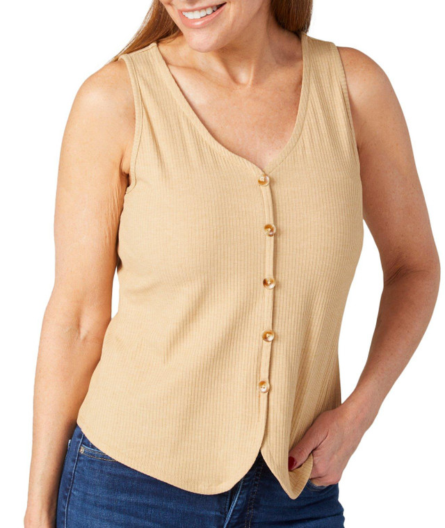 Elevate your layering game with this Sleeveless Ribbed Knit Vest. Featuring a stylish buttoned front, this vest offers a chic and versatile addition to your wardrobe. The ribbed knit fabric provides a comfortable and flattering fit, perfect for pairing with blouses, tees, or dresses. Ideal for both casual and dressy occasions, this vest adds a touch of sophistication and warmth to any outfit. Fabrication is 65% polyester, 27% rayon, 8% spandex.