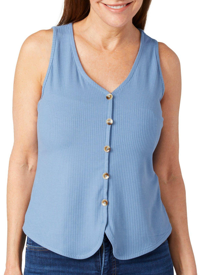Elevate your layering game with this Sleeveless Ribbed Knit Vest. Featuring a stylish buttoned front, this vest offers a chic and versatile addition to your wardrobe. The ribbed knit fabric provides a comfortable and flattering fit, perfect for pairing with blouses, tees, or dresses. Ideal for both casual and dressy occasions, this vest adds a touch of sophistication and warmth to any outfit. Fabrication is 65% polyester, 27% rayon, 8% spandex.