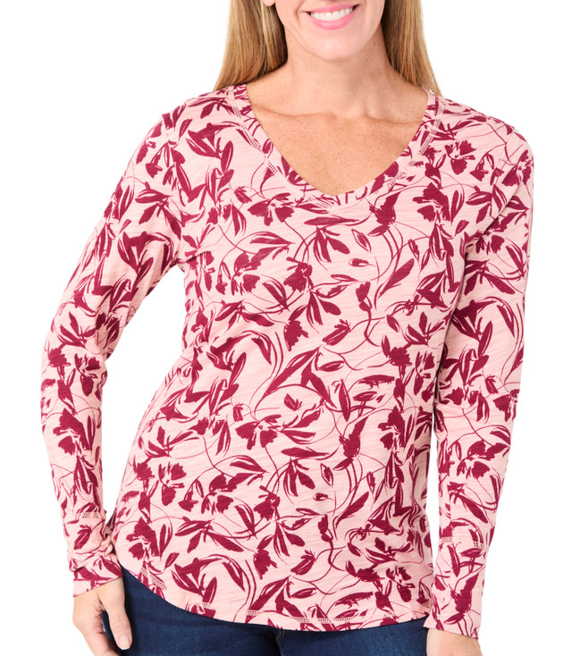 Balance softness and statement style with the Womens Scrolled Leaves Long Sleeve V-Neck Top. Featuring an allover dark red leaf silhouette on a pink background, it is detailed with contrast stitching at the neckline, cuffs and hemline for a laid back finish. The V-neckline and longer length offer flattering versatility for everyday wear. Fabrication is 60% cotton 40% modal. Length measures approximately 26 in.