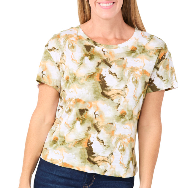 Add a modern twist to casual looks with the Womens Short Sleeve Cosmo Texture Print Crop Top featuring a marble inspired print, round neckline, and soft fabric finish. Ideal for layering or warm weather wear. Fabrication is 60% cotton 40% modal. Length measures approximately 22 in.