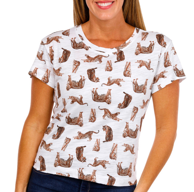 Elevate your casual look with the Womens Short Sleeve Crew Neck Tiger Luxey Crop Top, offering a soft breathable drape, chic tiger print and a modern cropped silhouette. Ideal for pairing with high rise jeans or layered under lightweight jackets for effortless style. Fabrication is 60% cotton 40% modal. Length measures approximately 22 in.