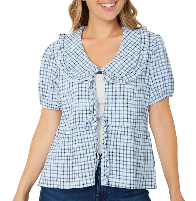 Sweet and stylish, this Short Sleeve Top features a classic gingham print with a playful tied front for a fresh, flirty finish. The lightweight fabric and relaxed fit make it perfect for sunny days, picnics, or casual outings. A timeless pattern with a modern twist. Fabrication is 78% polyester, 20% rayon, 2% spandex.