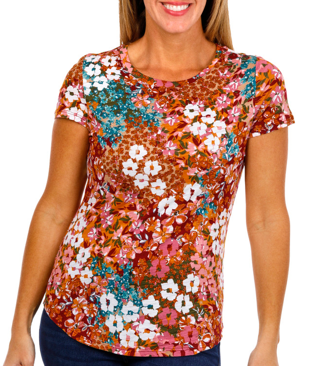 Add a stylish touch to your everyday wardrobe with the Womens Short Sleeve Round Neck Jade Patchwork Top. Featuring an allover jade patchwork floral pattern, the round neckline and short sleeves provide effortless versatility for work or weekend wear. Fabrication is 60% cotton 40% modal. Length measures approximately 26 in.
