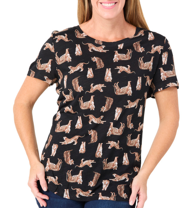 Bring bold elegance to everyday wear with the Womens Short Sleeve Scoop Neck Luxey Print Top featuring an allover print of wild tigers in dynamic poses. Designed with a soft hand feel, short sleeves, and a flattering scoop neckline. Fabrication is 60% cotton 40% modal. Length measures approximately 28 in.