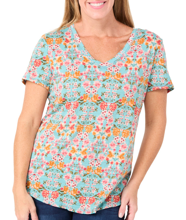 Add softness and style to your day with the Womens Short Sleeve V-Neck Floral Print Top featuring an allover ornamental floral print design and a flattering V-neckline. Perfect for casual wear or effortless layering. Fabrication is 60% cotton 40% modal. Length measures approximately 28 in.