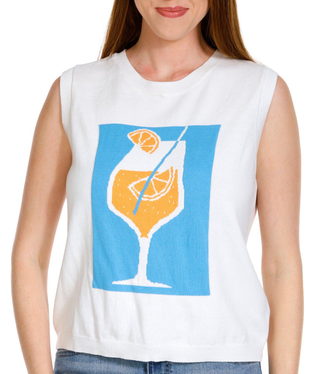 Introducing our Women's Summer Spritzer Sweater Tank Top, crafted from 100% cotton for a soft and breathable feel. This unique top features a fun spritzer cocktail print on the front, a classic crew neckline, and a sleeveless design. The sweater material adds a cozy touch, making it perfect for warm summer days and casual outings. Add a splash of fun to your wardrobe with this stylish and playful piece.