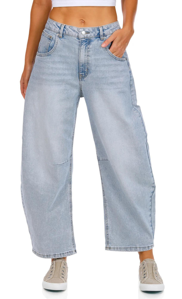 Show off trendy style with these Juniors Mid Rise Barrel Leg Jeans. Featuring a button fly front zip closure and roomy barrel leg design, they offer comfort with a trendy twist. Finished with front and back pockets and a fun teddy bear bag charm. Fabrication 65% cotton, 31% polyester, 1% spandex, 3% rayon