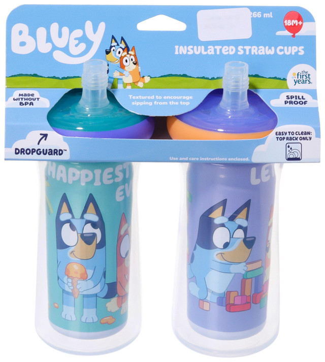 Keep drinks cool and mess-free with this 2-pack of Bluey insulated straw cups. Each cup holds 9 fluid ounces and is designed for little ones 18 months and older. Made without BPA, these cups are spillproof and safe for top rack dishwasher cleaning. Featuring fun Bluey graphics, theyre perfect for everyday use at home or on the go.