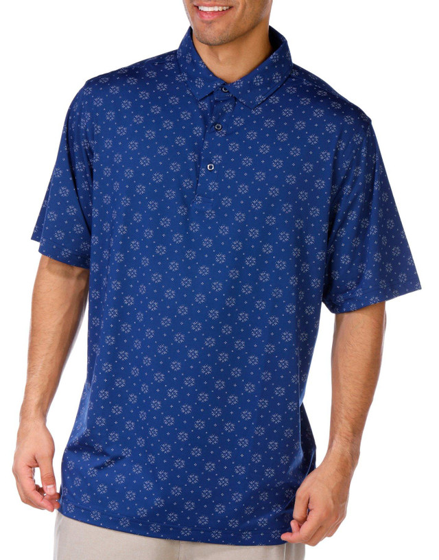 Stay active and stylish in this mens performance polo featuring stretchy fabric and an allover pattern. Designed for comfort and easy movement, this shirt offers a polished look with breathable wear. Ideal for casual outings, golf days or warm weather activities. Fabrication is 92% polyester and 8% spandex.
