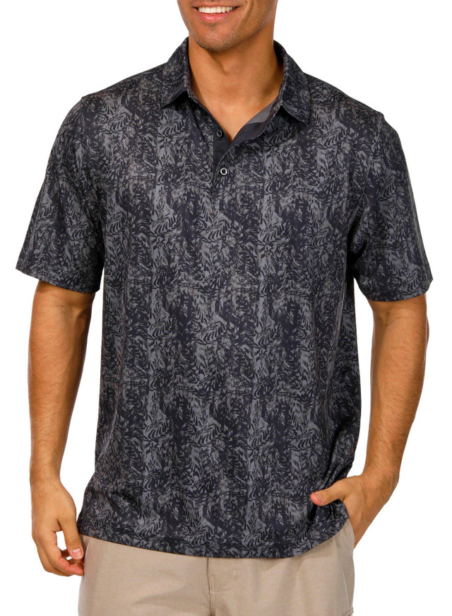 This short sleeve polo performance shirt features a tonal leaf print and stretchy fabric for all day comfort. Sleek and breathable design makes it a great choice for active plans or relaxed weekends. Fabrication is 92% polyester and 8% spandex.