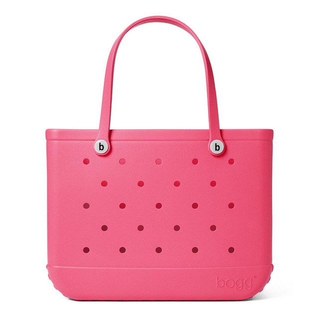 This Bogg Beach Tote Bag features a solid color design on a sturdy EVA fabrication with perforated sides, a durable pebbled bottom, and dual strap handles. Bag is durable, washable, sturdy, and tip-proof. Measures approximately 19 in x 9.5 in x 15 in.