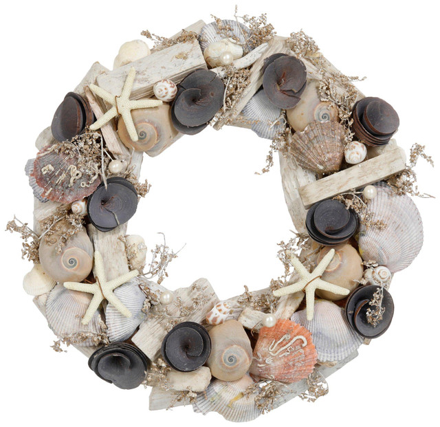 Welcome coastal charm into your home with this 12 in Driftwood Shell Wreath from Boston International. This wreath feautures brightly colored shells, starfish, pearls and driftwood. This small wreath is perfect for accenting your front door or as a centerpeice on any table.