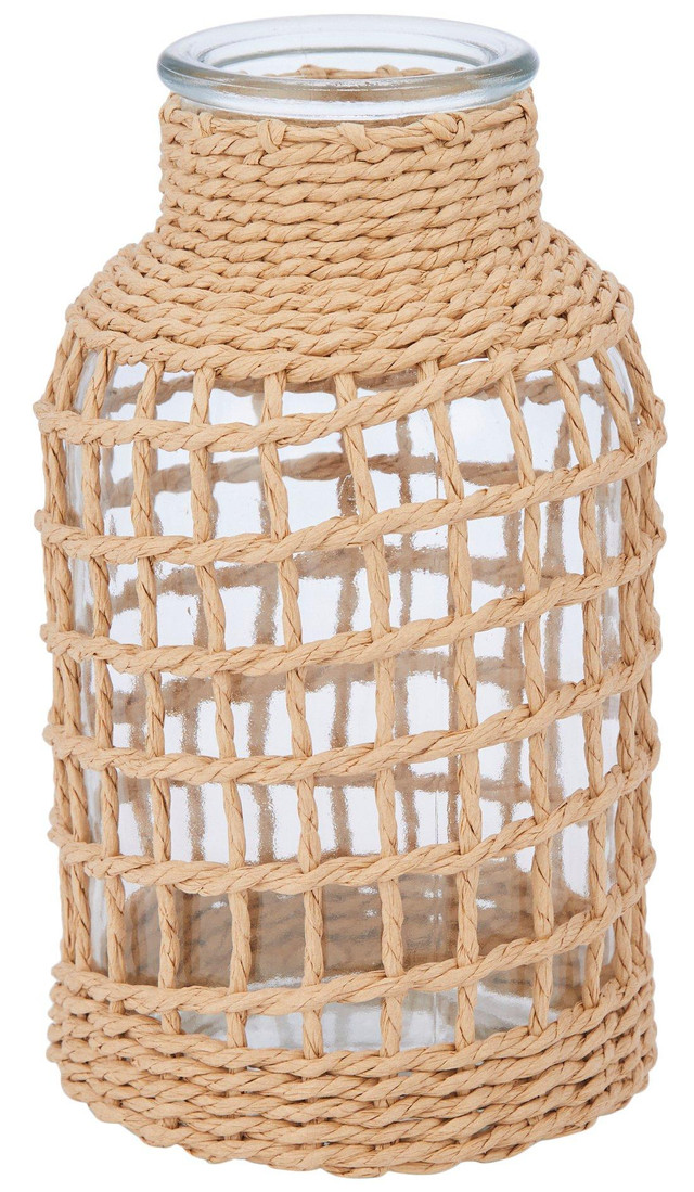 Bring a touch of coastal decor to any room with this elegant glass vase with rope accents. It's perfect for transforming your home or condo into a beach-inspired retreat. It makes a beautiful accent or a thoughtful gift. Measures approximately 8 in x 4.5 in.