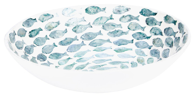 Serve in style with this eye-catching 13 diameter serving bowl, featuring a graceful swirling fish pattern on the interior. Made from capiz shell and paper, it offers a unique blend of natural shimmer and lightweight durability. With a round design and 3 height, this bowl is ideal for presenting salads, fruits, or snacks, making it a standout piece for coastal-themed entertaining.