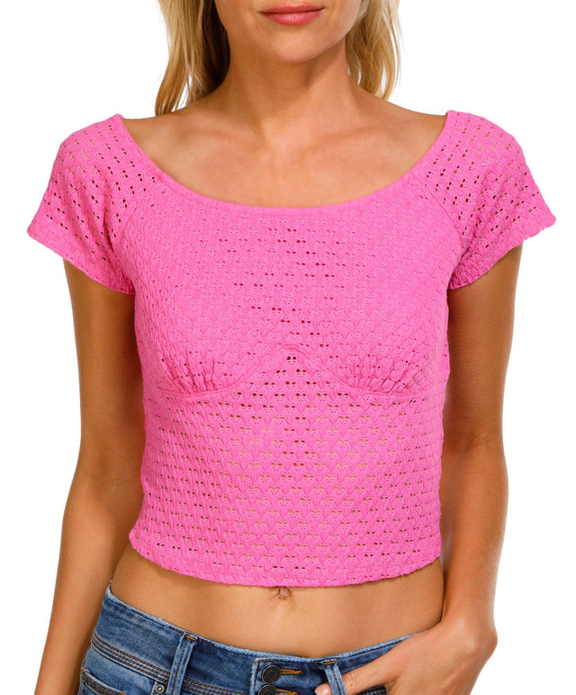 Introducing the Juniors Crochet Off The Shoulder Top, crafted from a blend of cotton, polyester, nylon, and spandex for a comfortable and flexible fit. This stylish top features a crochet exterior, a round neckline, and short sleeves. The off-the-shoulder design adds a trendy touch, while the cropped length makes it perfect for pairing with high-waisted bottoms for a chic, fashionable look.