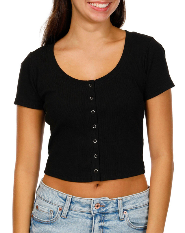 Keep it casual and cute with this Juniors Short Sleeve Ribbed Snap Button Top, featuring a solid color, snap-front detail, and a trendy cropped length. Perfect for pairing with high-rise jeans or skirts. Fabrication 57% cotton, 38% polyester, 5% spandex