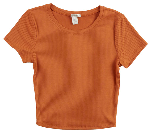 This top features a solid color design on soft lightweight ribbed stretch knit fabric, short sleeves, a crew neckline, and crop styling. Fabrication is 93% rayon, 7% spandex.