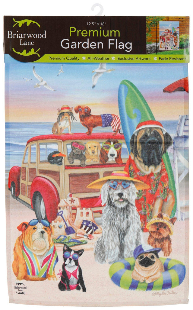 Add playful coastal style to your outdoor decor with this 18 in Beach Dogs Garden Flag, featuring a group of dogs with surfboards, hats, and sunglasses gathered in front of a vintage truck at the beach. A sunset backdrop completes the cheerful summer scene. Made from durable polyester for vibrant, weather resistant display. Fabrication is 100% Polyester. Measures approximately 12.5 in x 18 in.