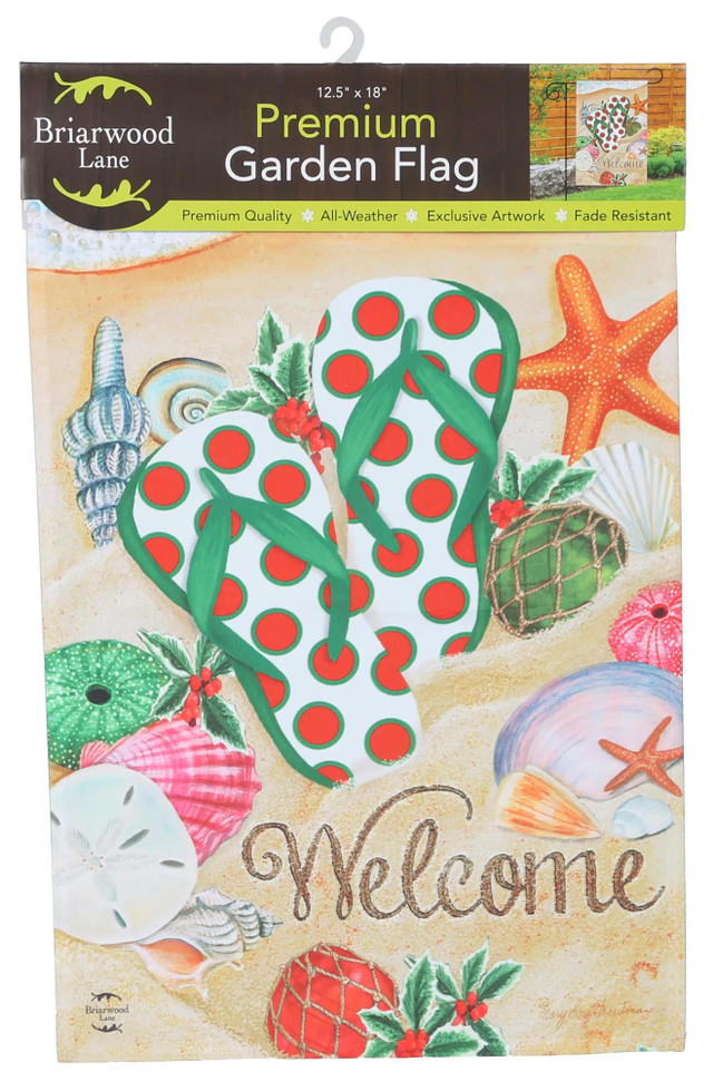 Celebrate the season with the 18 inch Christmas Flip Flops Welcome Garden Flag which features colorful Christmas flip flops on the beach with Welcome text for festive curb appeal. Made from durable polyester for vibrant outdoor display, its perfect for adding holiday charm to gardens, patios, or walkways and makes a great gift. Fabrication is 100% polyester. Measures approximately 12.5 in x 18 in.
