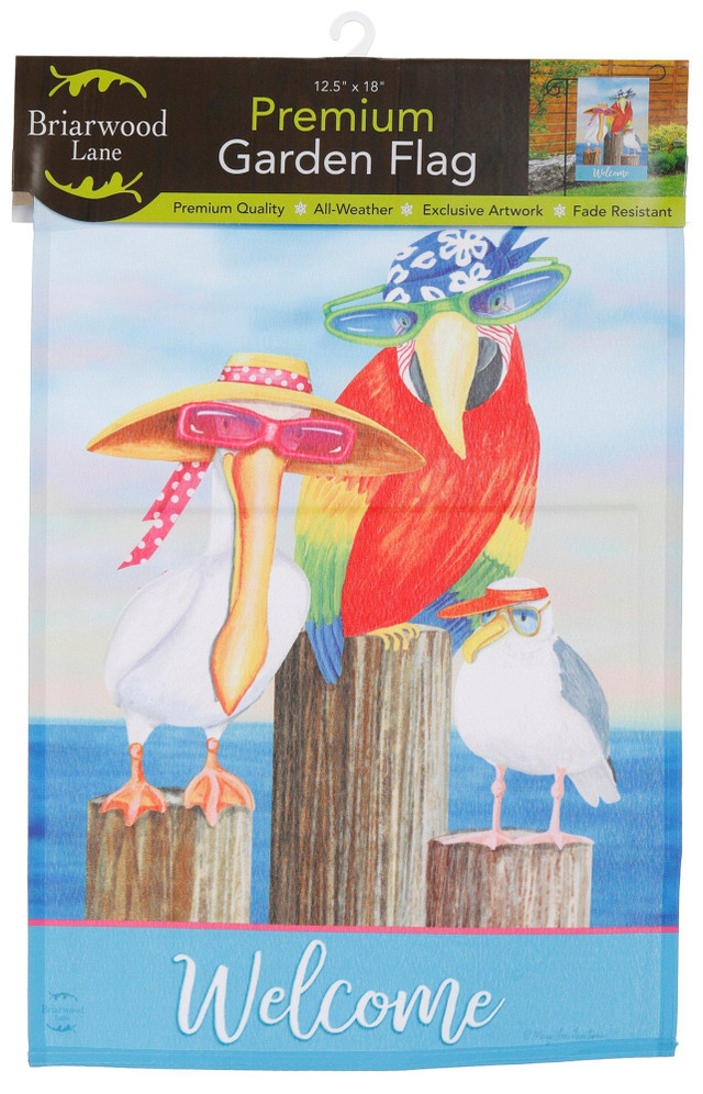 Celebrate warm weather with this 18 in Coastal Bird Welcome Summer Garden Flag, featuring a colorful parrot and other coastal birds wearing sunglasses. Made from 100% polyester for durability and vibrant outdoor display. Perfect for adding playful charm to gardens, patios, or walkways all summer long. Fabrication is 100% Polyester. Measures approximately 12.5 in x 18 in.
