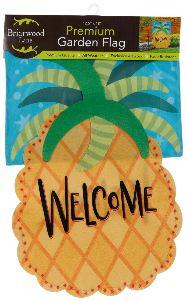 Add a tropical touch to your outdoor decor with this 18 in Welcome Pineapple Applique Garden Flag, featuring a unique pineapple shaped bottom with applique leaves and embroidered details around the word Welcome for added dimension. Made from durable polyester for vibrant, weather resistant display. Fabrication is 100% polyester. Measures approximately 12.5 in x 18 in.