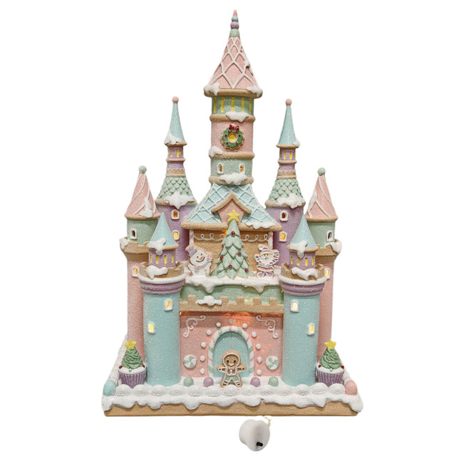 Create a magical holiday scene with this 17-inch gingerbread castle from the Sugar Plums Collection. Crafted from polyresin in soft pastel hues, it features icing-like details, festive décor, and a glowing LED light. Complete with whimsical towers and a tiny polar bear at the base, it's a sweet statement piece for your seasonal display. Measures 10 x 7 x 17 inches.