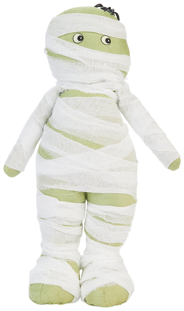 Add eerie charm to your setup with this 18 in Standing Mummy Halloween Decor. Wrapped in textured gauze and detailed with a small spider perched on its head, this figure brings classic Halloween character to mantels, entryways or tabletops. Lightweight and freestanding for easy placement. For indoor seasonal display only. Dust gently to maintain appearance. Measures approximately 18 in x 11 in x 4 in.